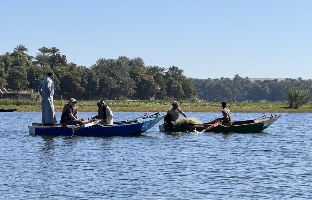 a photo showing a dahabiya in the middle of the Nile in Egypt